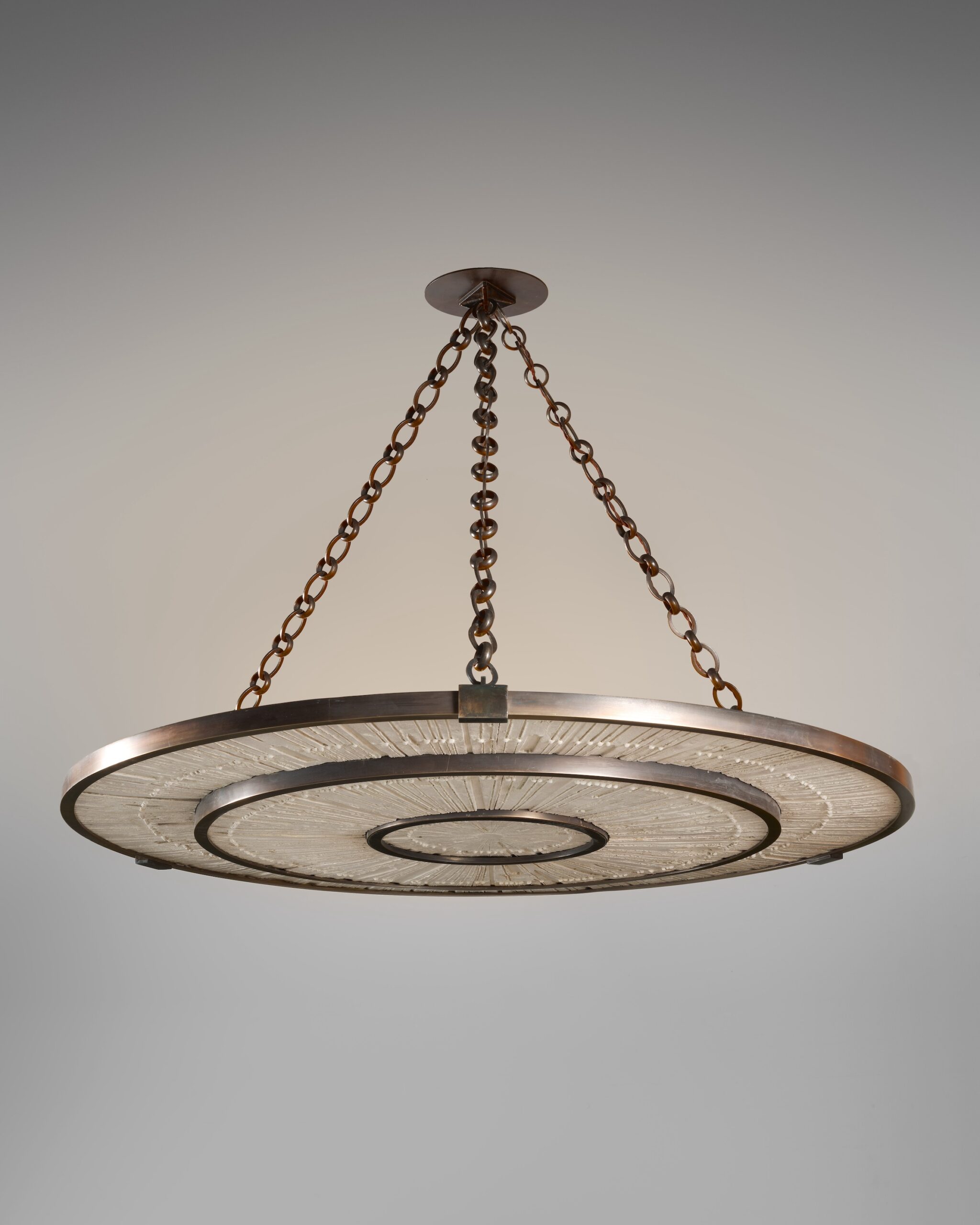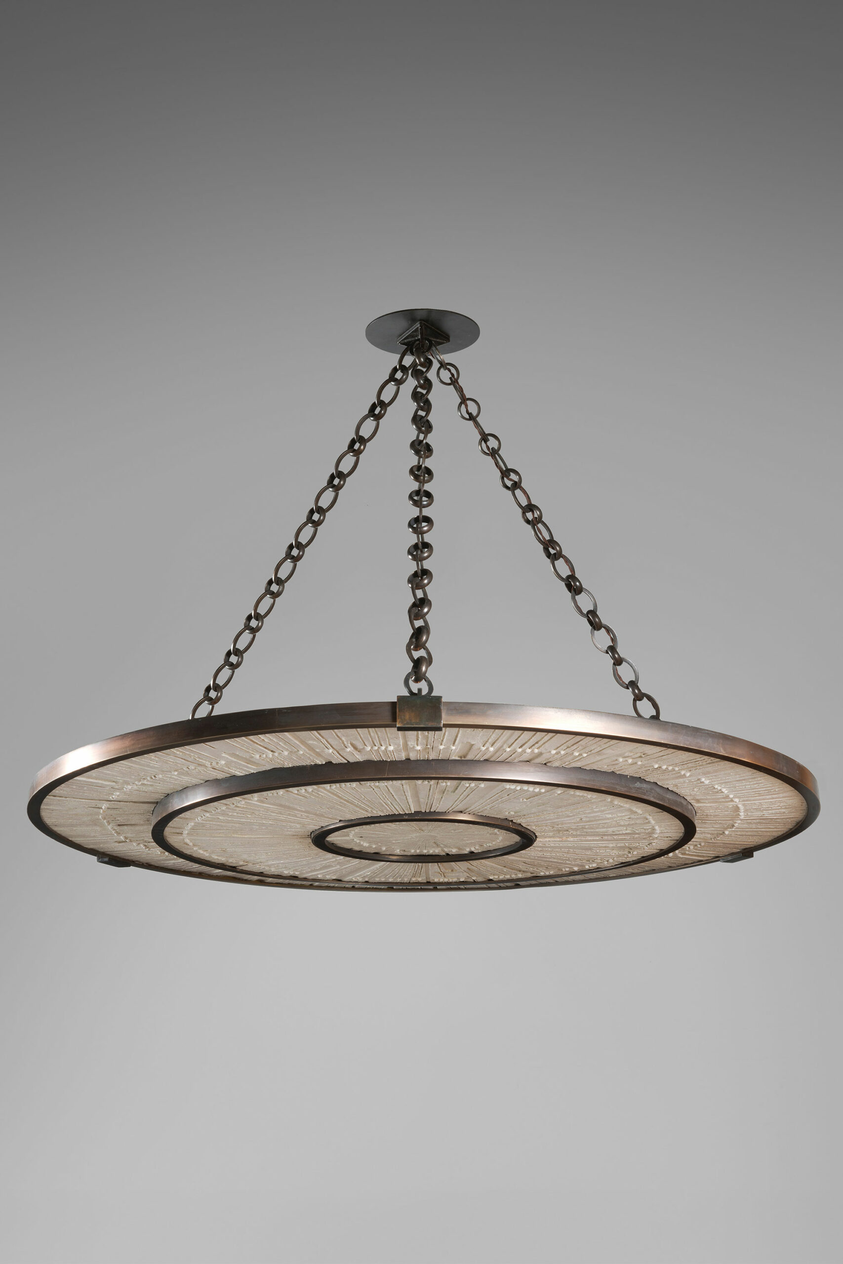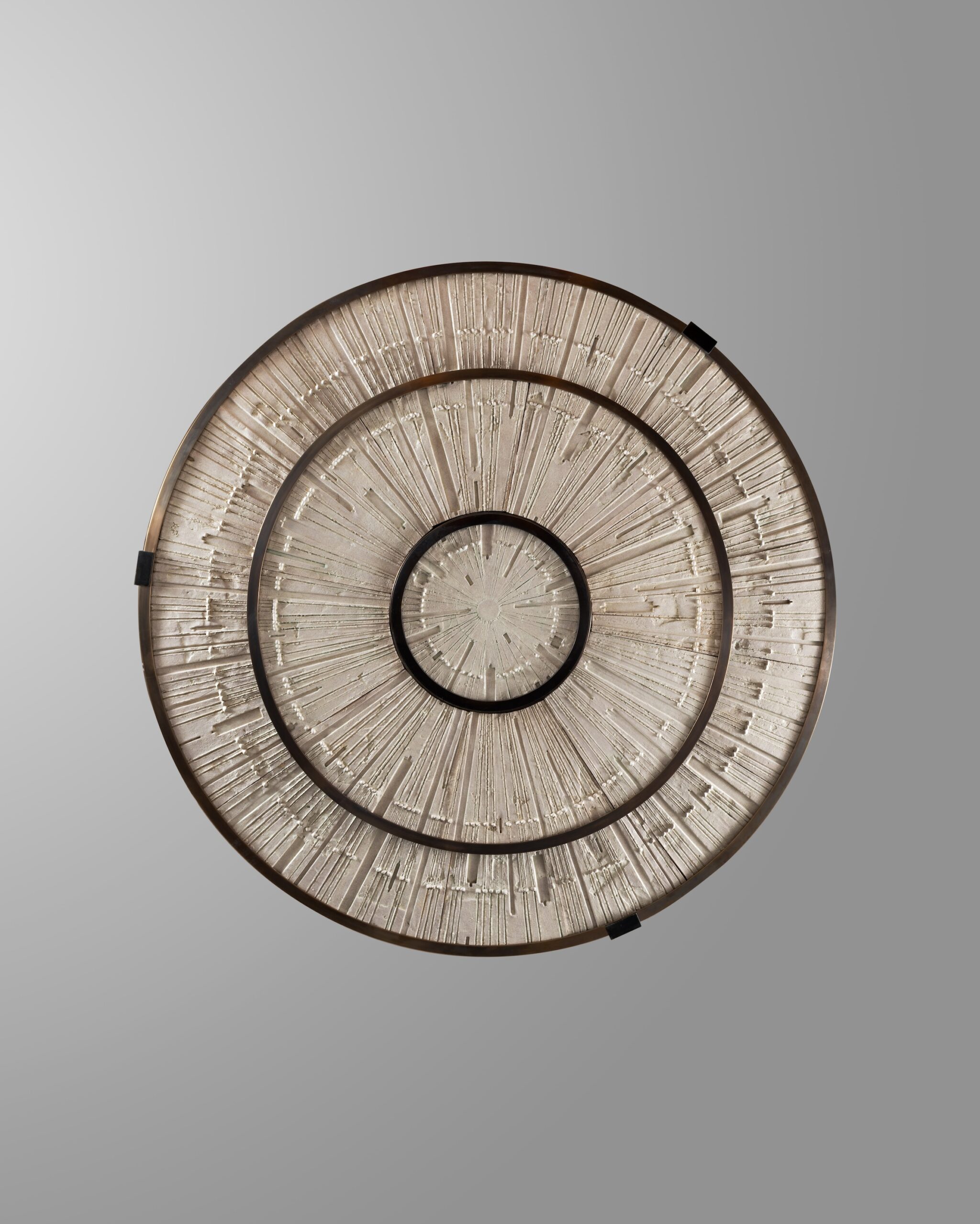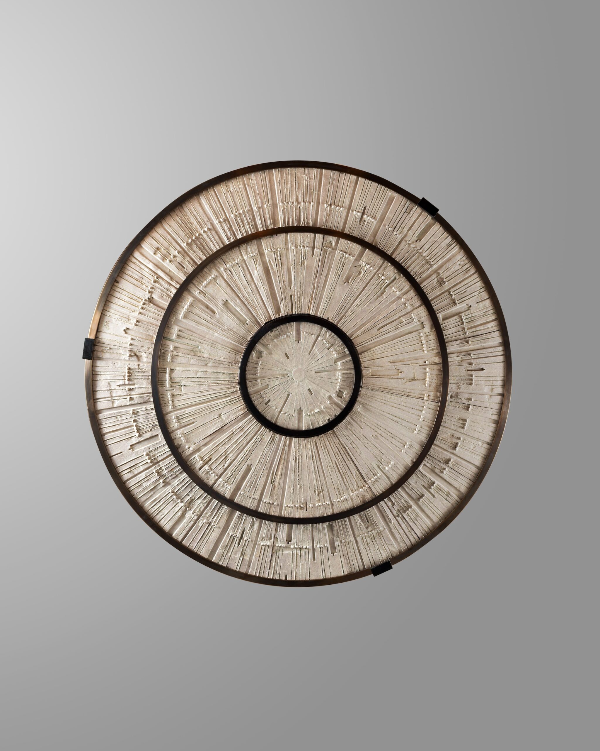 Suspension in bronze and ceramic with Starburst pattern by Antoinette FaragallahMaterials: Bronze, ceramic cream finish, LED light, bronze chainsDimensions (cm) : 90 x 122 x 122Year: 2026